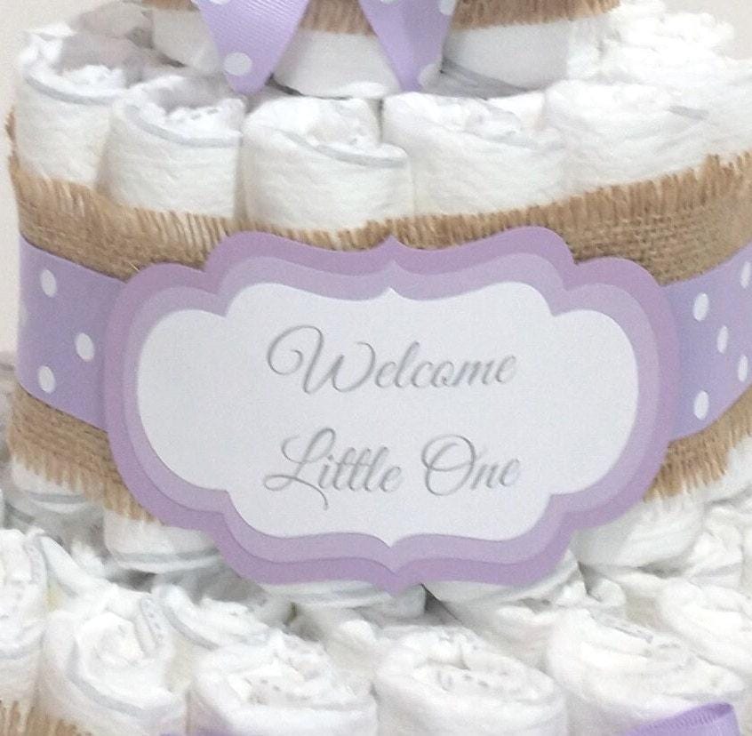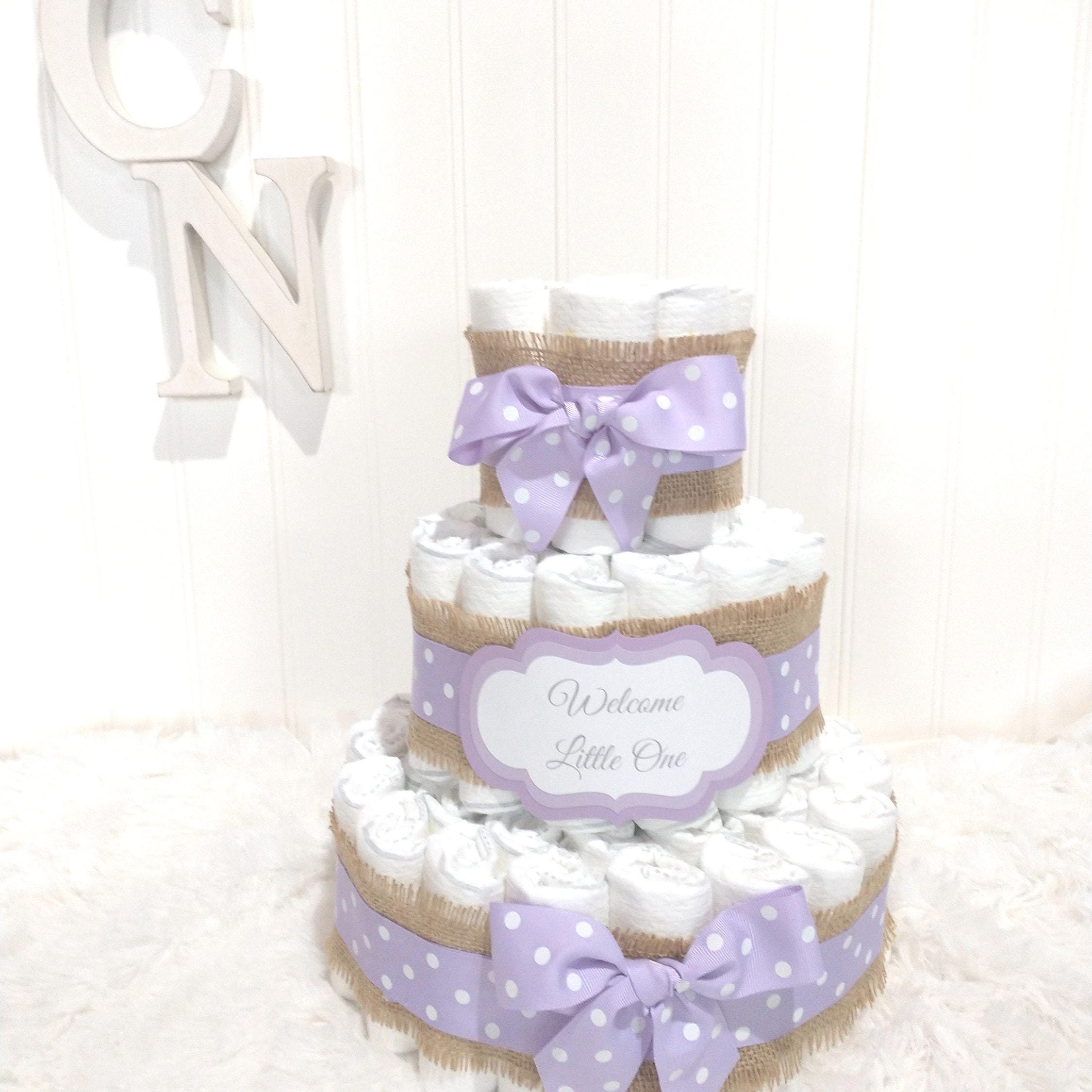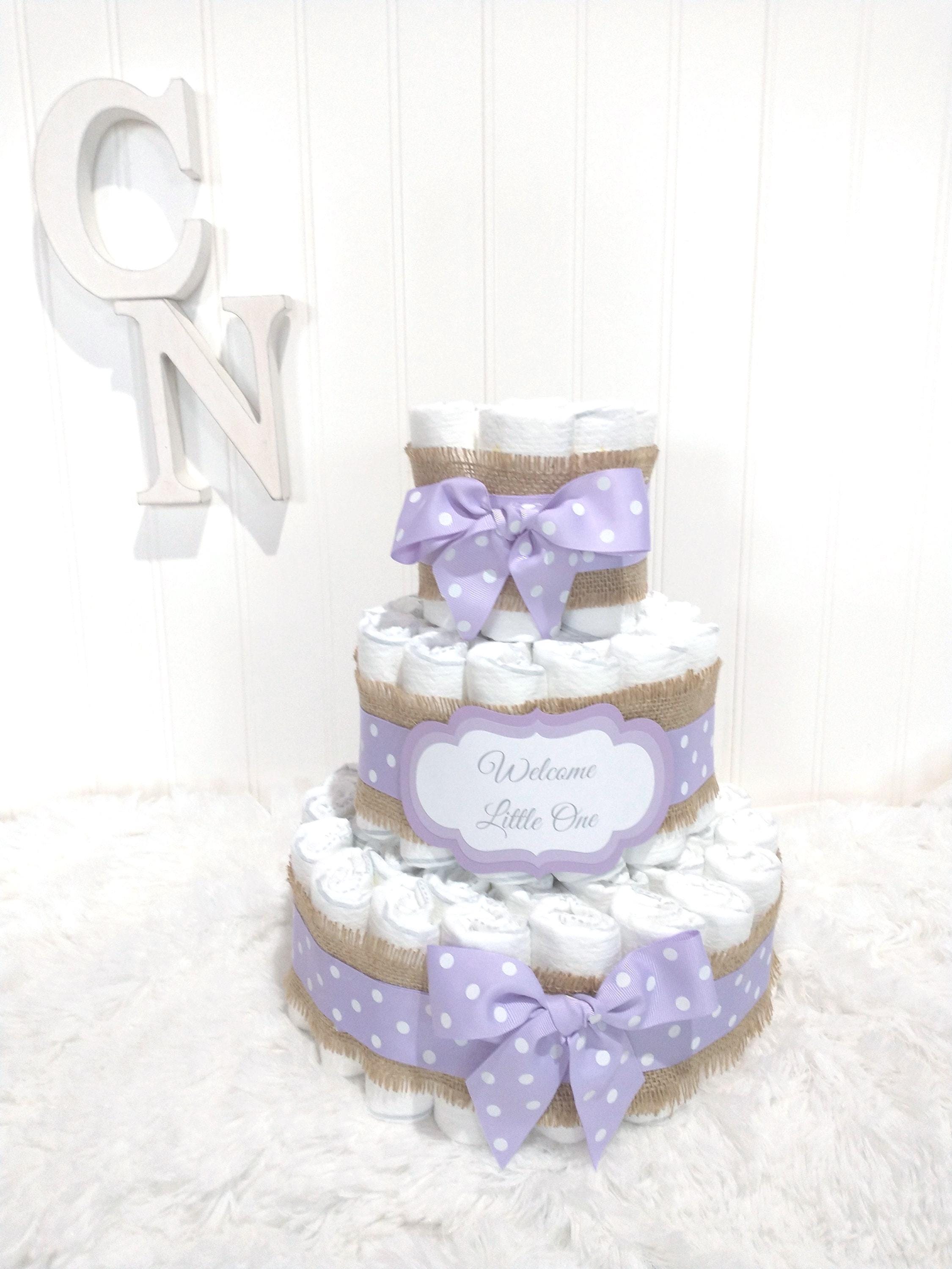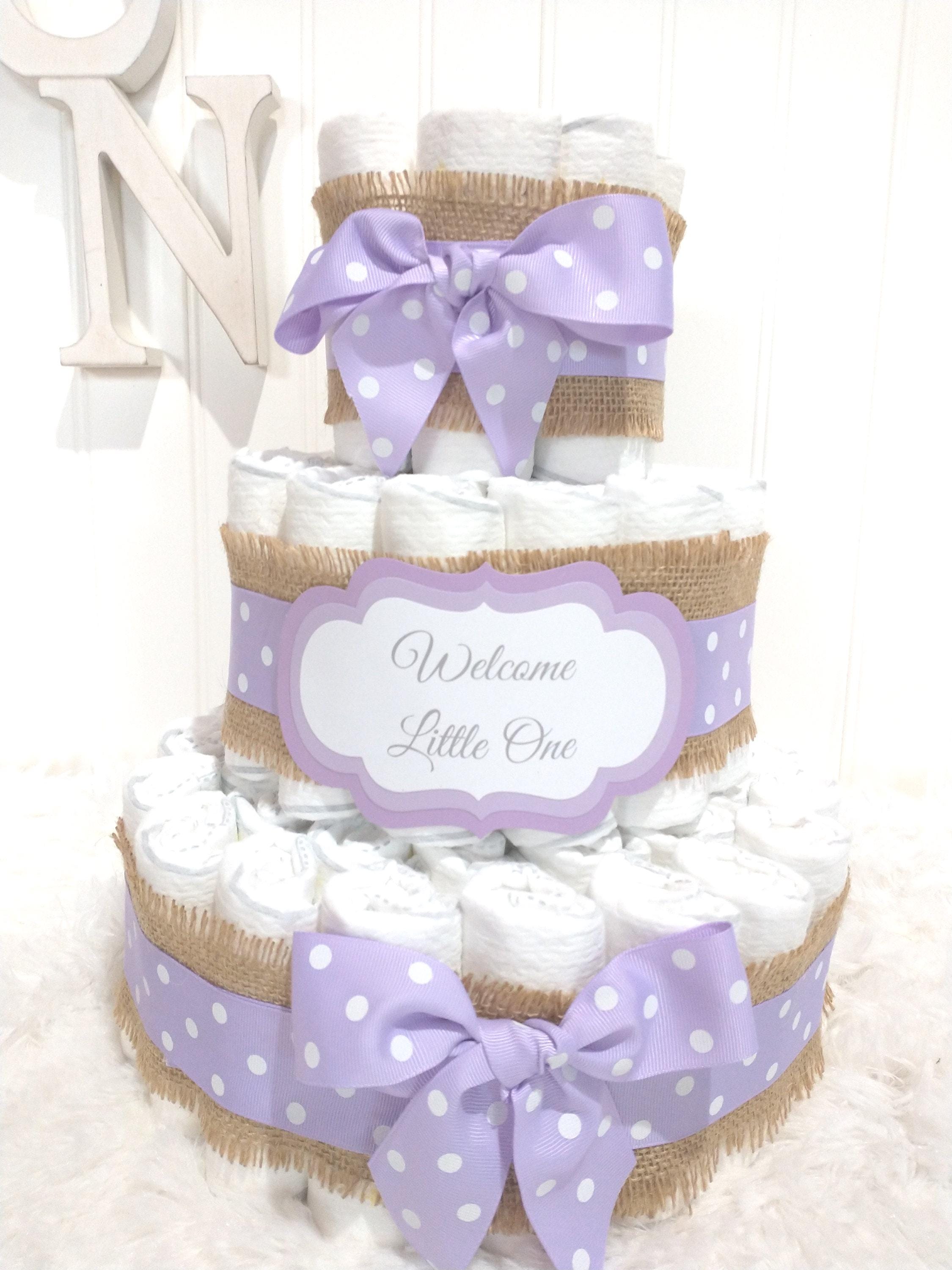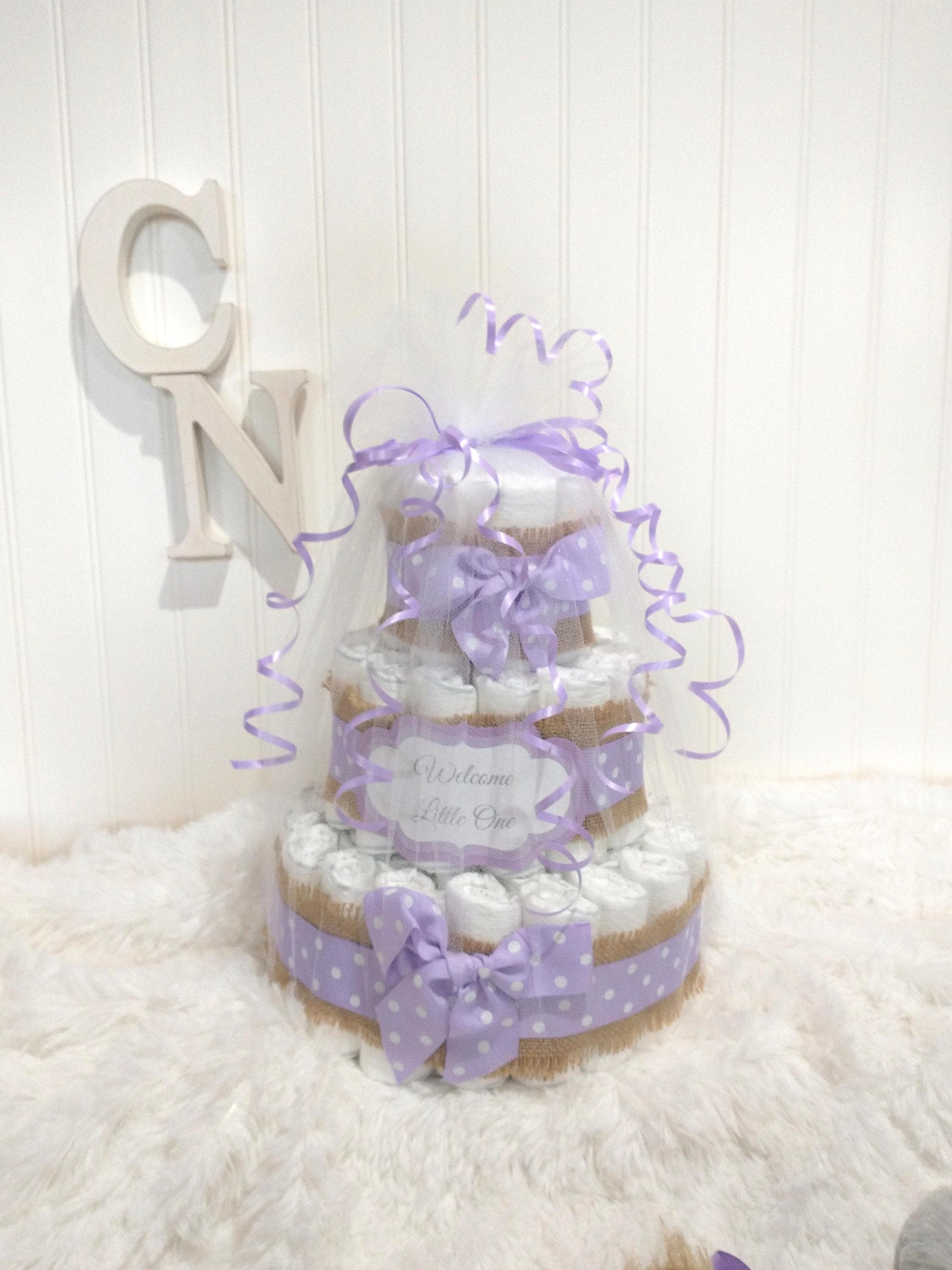 A Baby Diaper cake is the perfect gift for a baby shower, new mom or to welcome a new little one! Adorable Purple Diaper Cake. This rustic Boho table decoration or centerpiece is also the sweetest personalized baby shower gift. Simple rustic burlap pairs beautifully with lavender grosgrain ribbon. This small diaper cake can be personalized with a message, name or even change the color, a perfect , useful inexpensive gift for a new baby, welcome home present, mommy to be gift, or corporate gift from group.