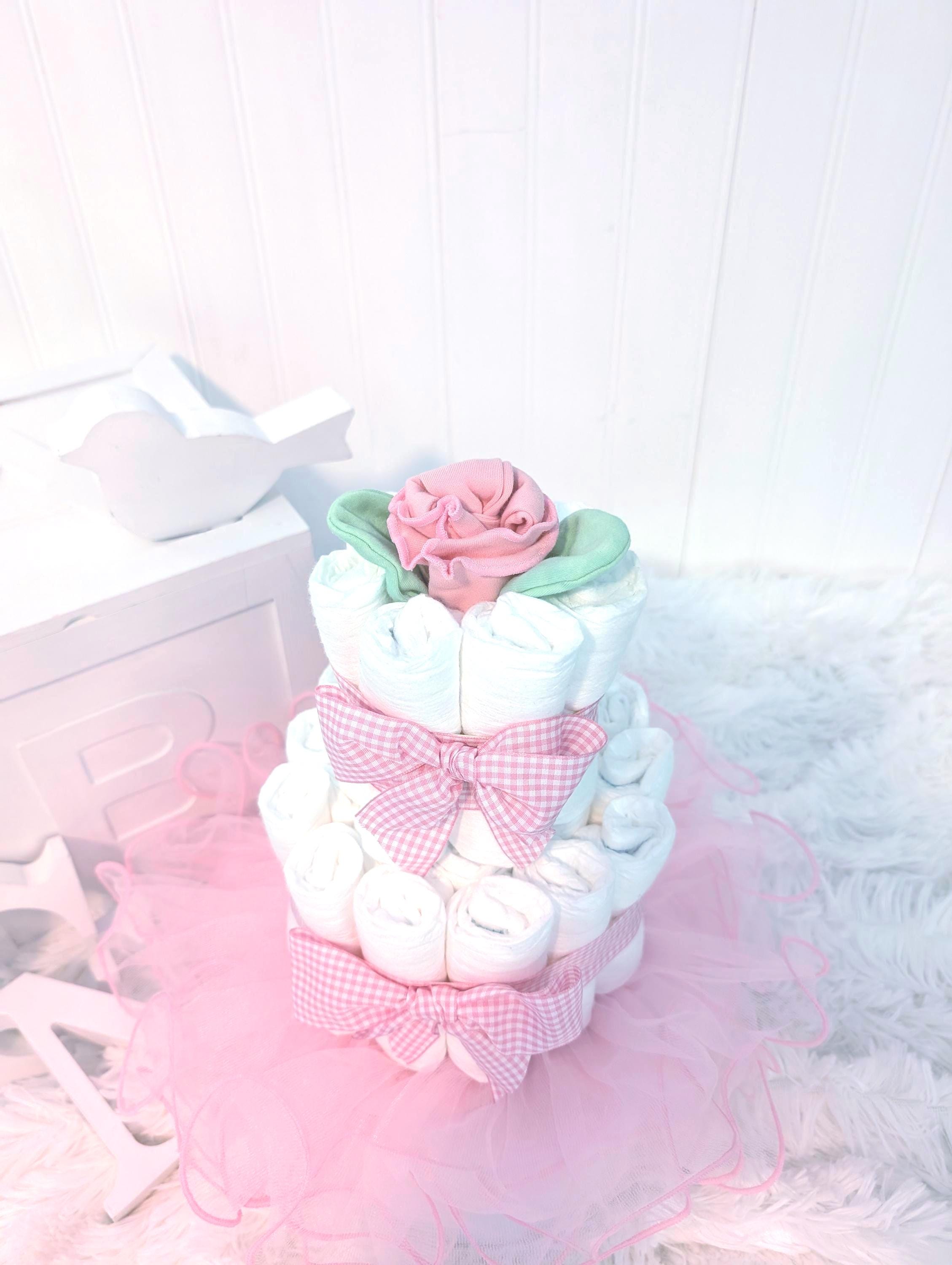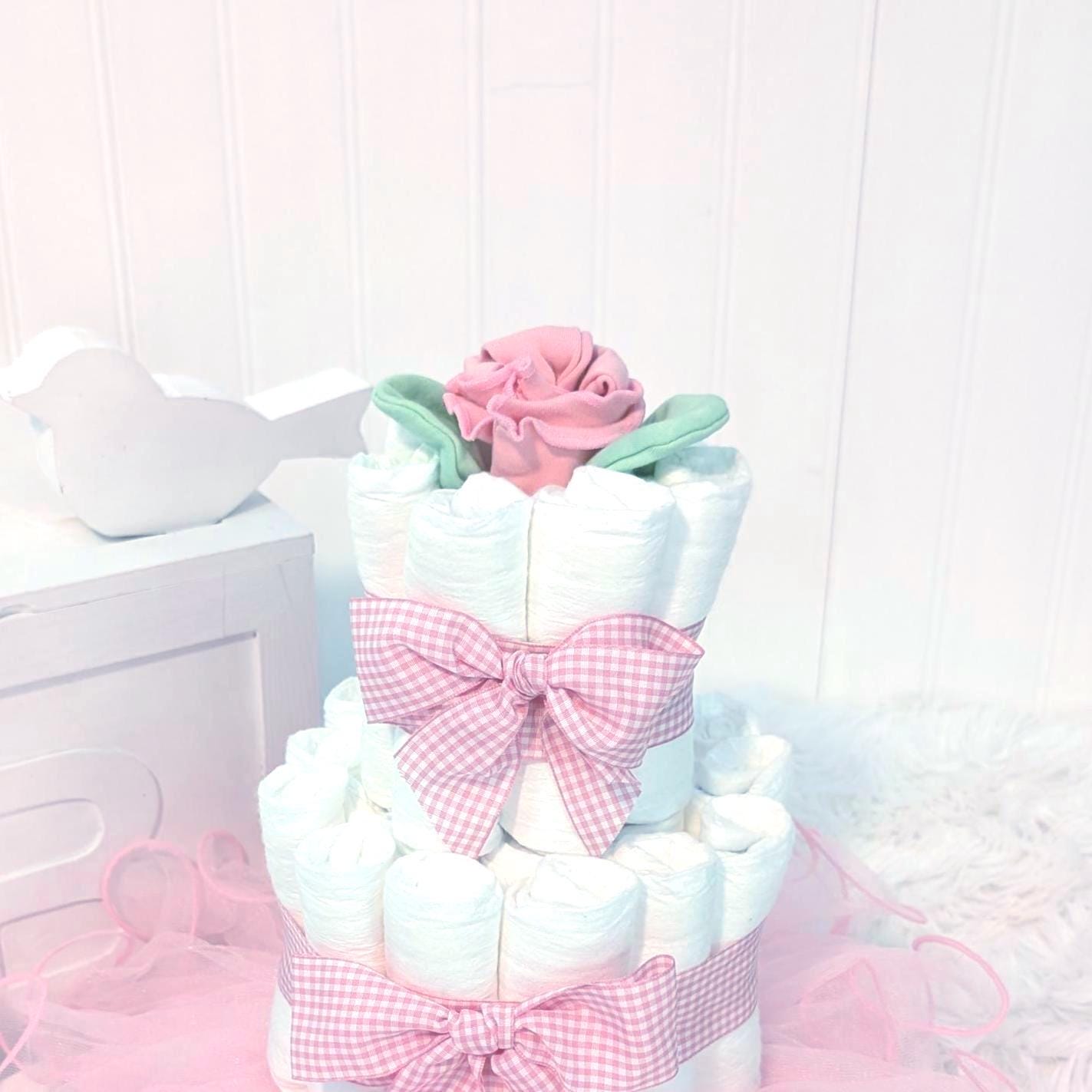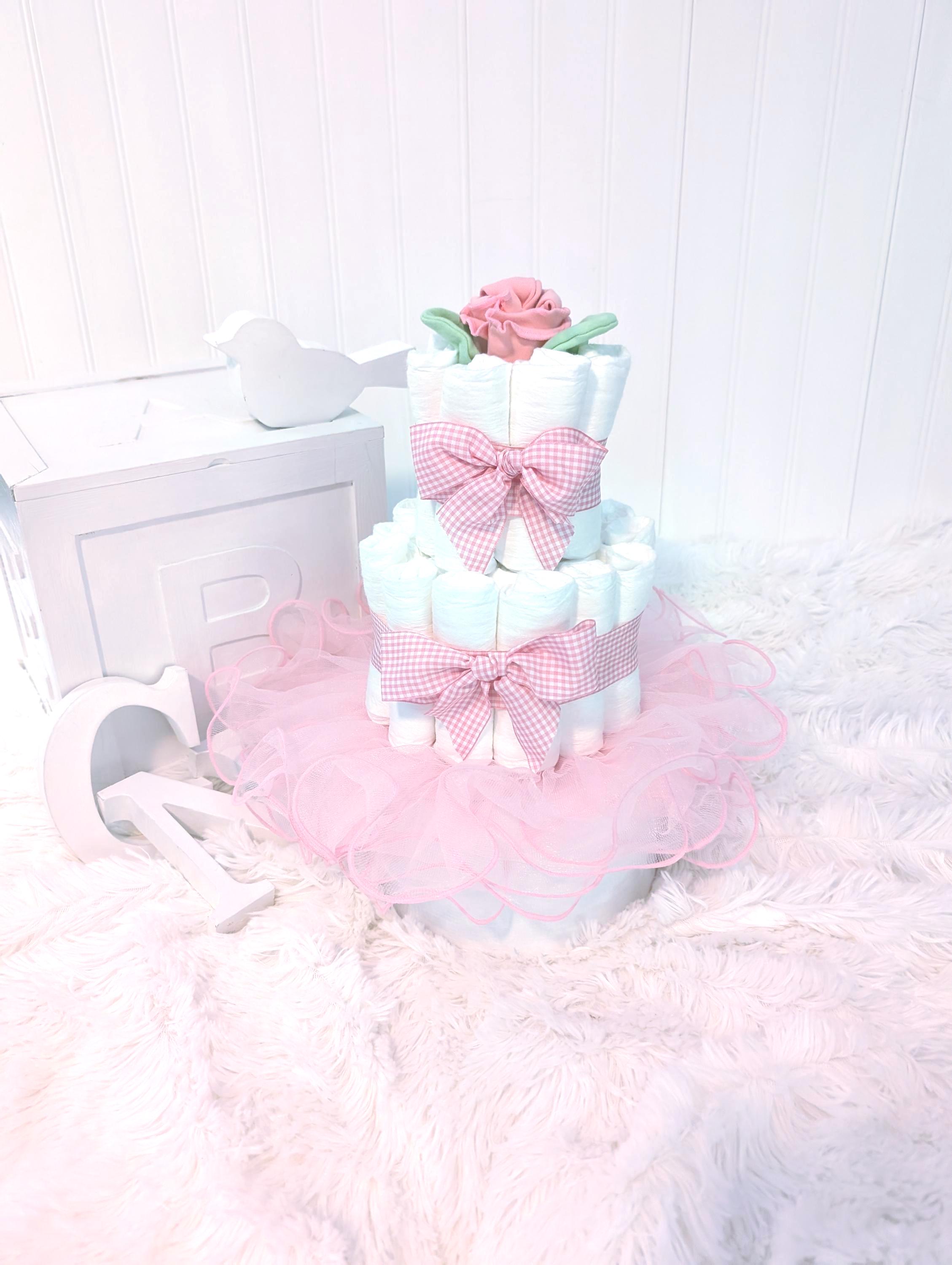 Need a cute baby gift? This adorable pink gingham diaper cake is the perfect baby shower gift, new mom gift or to welcome a new little one! This diaper cake is simple yet perfect. The little rose on top is actually a newborn hat and scratch mittens! And the pink tutu is perfect for a girly photo shoot!A beautiful, simple gift just as it is. This is also a beautiful diaper cake for a centerpiece or baby shower decor!