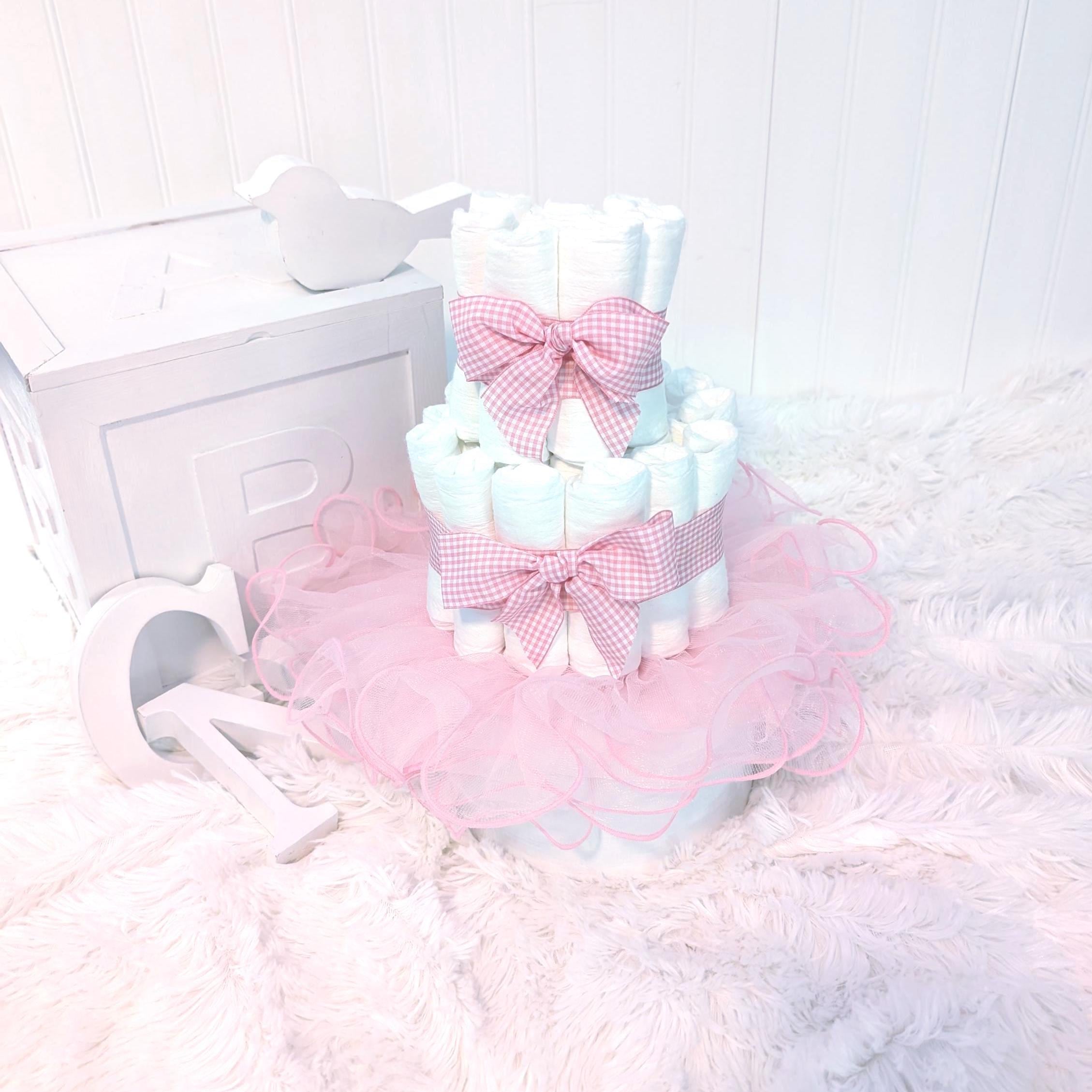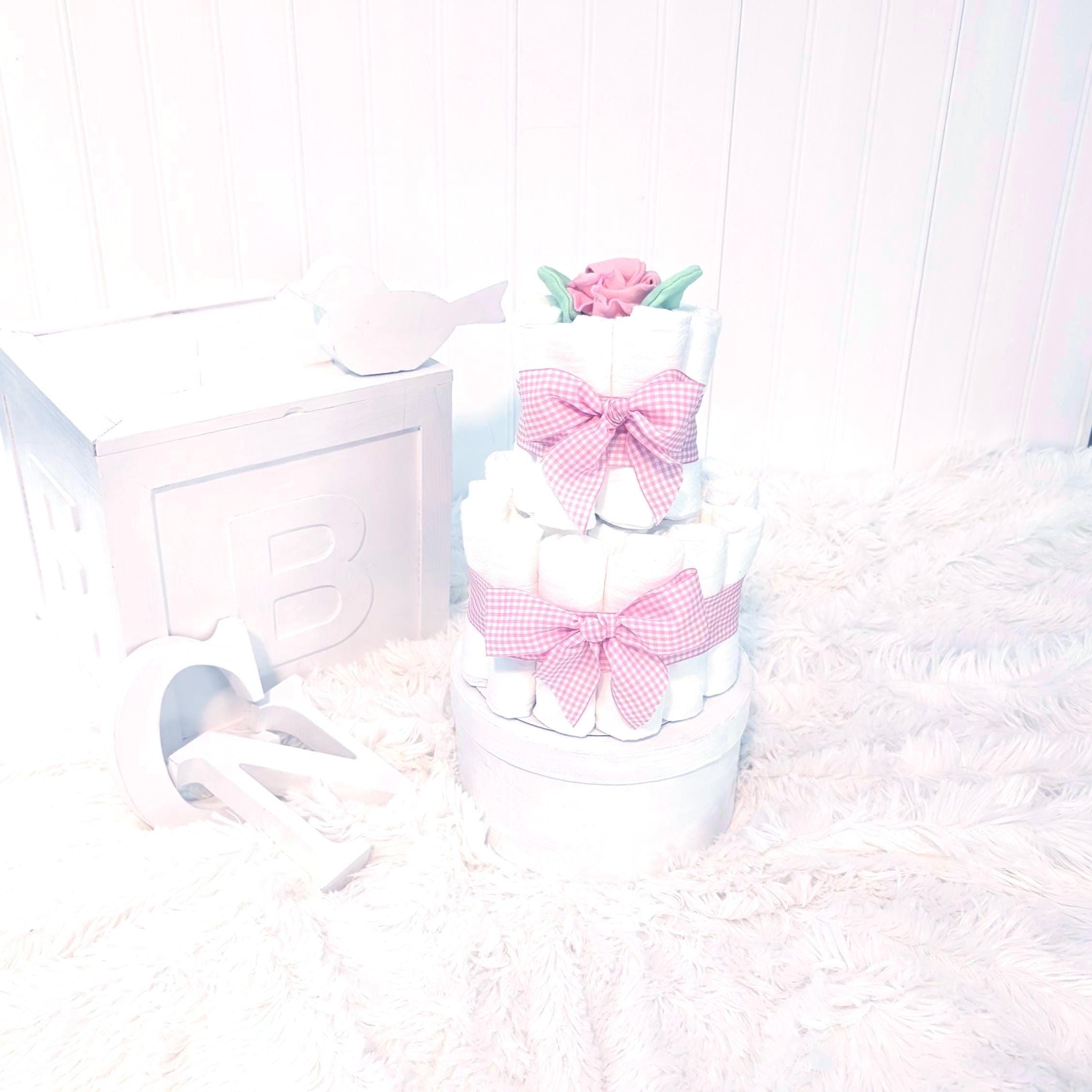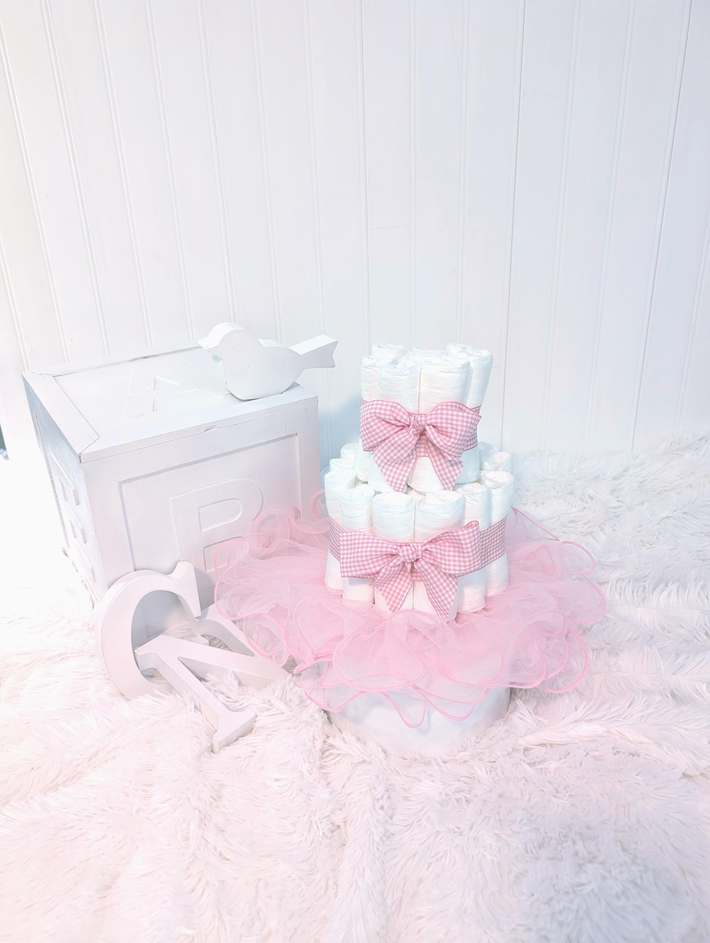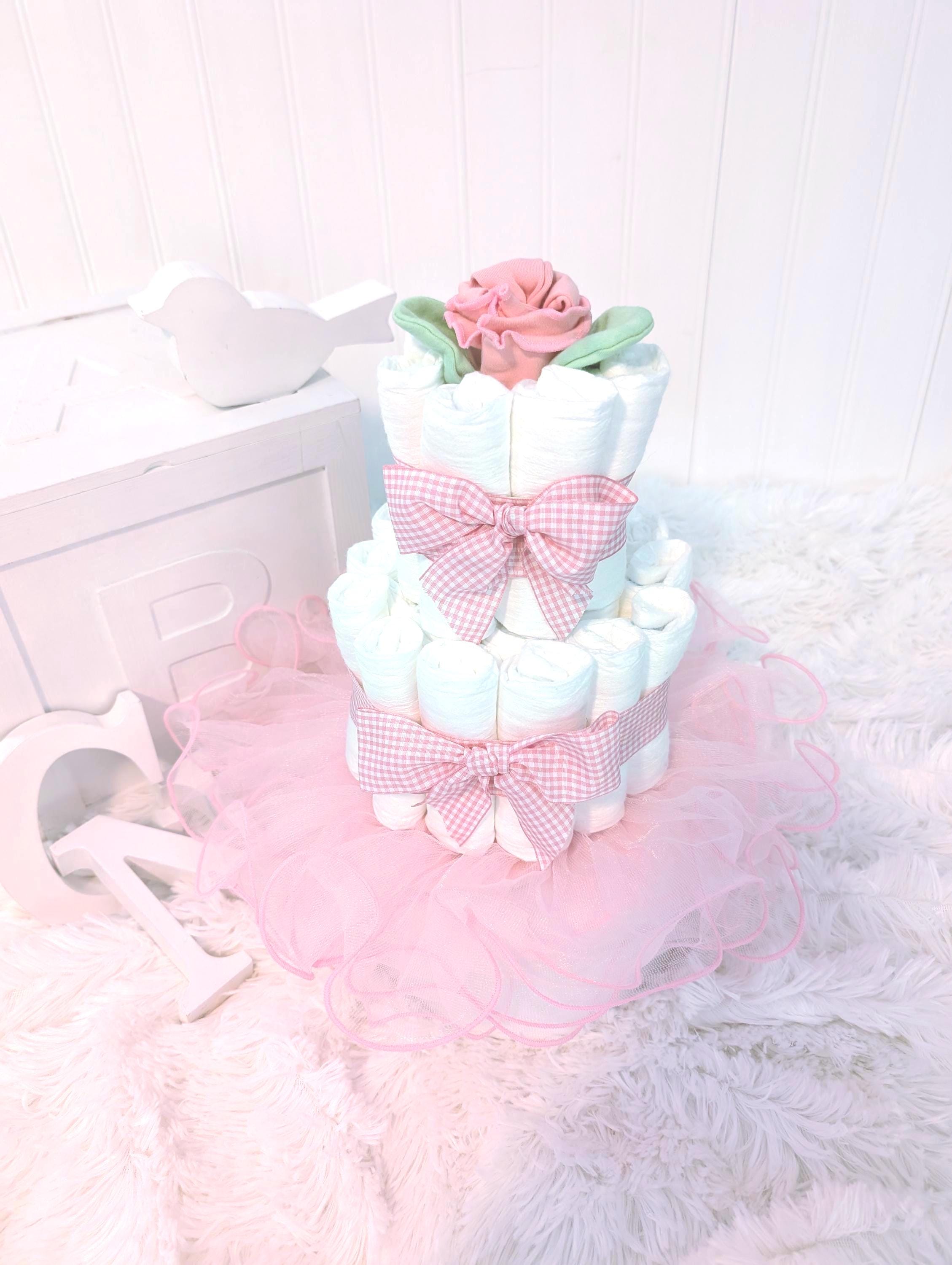 Need a cute baby gift? This adorable pink gingham diaper cake is the perfect baby shower gift, new mom gift or to welcome a new little one! This diaper cake is simple yet perfect. The little rose on top is actually a newborn hat and scratch mittens! And the pink tutu is perfect for a girly photo shoot!A beautiful, simple gift just as it is. This is also a beautiful diaper cake for a centerpiece or baby shower decor!